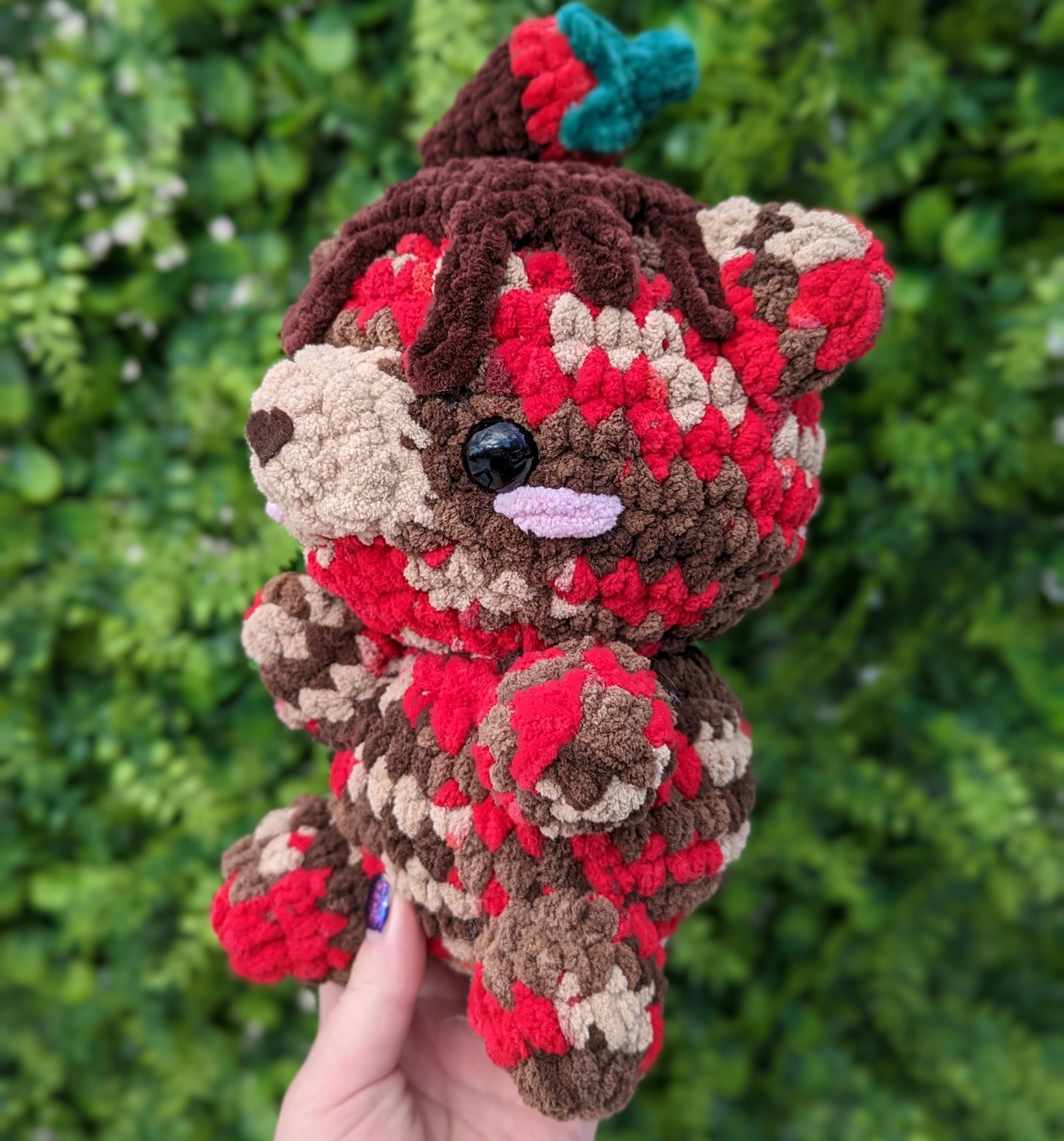 DelaraesCreations, Delaraes Creations, crochet plushie, amigurumi plush, stuffed animal, stuffed toy, stuffie, crochet teddy bear, kawaii, amigurumi teddy bear, stuffed bear, bear plushie, gift, chubby bear, chunky plushie, Josabellas, mitten the bear pattern, gifts for her, cottagecore, baby gifts, birthday gift, valentines gift, chocolate strawberry, strawberry bear